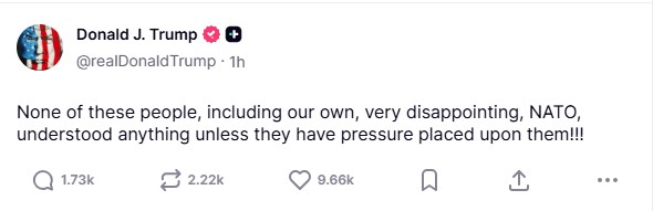«Κανείς από αυτούς τους ανθρώπους, συμπεριλαμβανομένων και του δικού μας, πολύ απογοητευτικού ΝΑΤΟ, κατάλαβε κάτι, εκτός κι αν τους ασκηθεί πίεση», έγραψε ο Αμερικανός πρόεδρος στο Truth Social, εξαπολύοντας νέα, ευθεία επίθεση κατά της Βορειοατλαντικής Συμμαχίας.